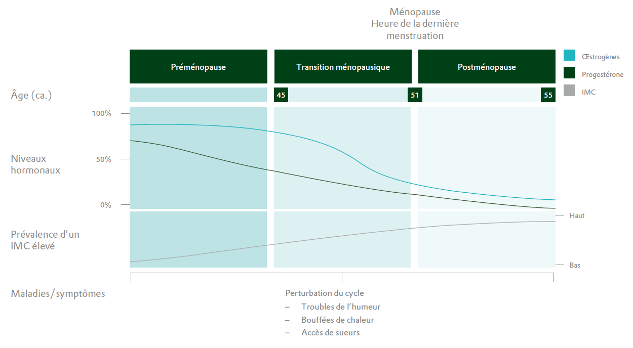 La période à partir de la ménopause fait l’objet d’une attention particulière. Si cette phase de changement hormonal ne provoque pas en soi de maladies cardiaques, elle marque néanmoins un tournant : la tension artérielle, le cholestérol et le métabolisme se modifient sensiblement, ce qui entraîne une augmentation du risque de troubles cardiovasculaires.2